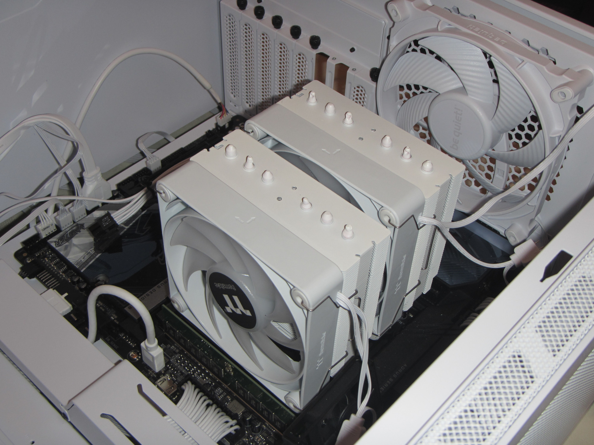 I was also able to move the fans down relative to the heat sink fins, so they protrude a bit and blow under the cooler too. Which the motherboard seems to be designed for, with voltage regulators and M.2 storage devices depending on airflow around the CPU. Definitely made the M.2 device 5C cooler.
