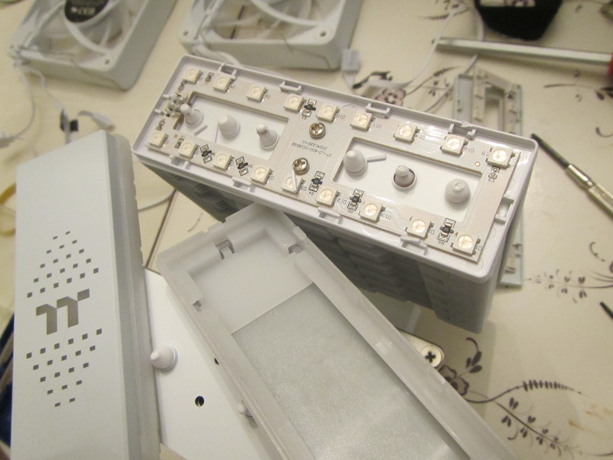 Even removed from the fins, the lighting still had the bad resistance reading. So it's either the circuits themselves or someone wired up one cable backwards in parallel with the other light. Either way, it's better to get rid of something that could cause motherboard damage if plugged in. Fortunately the heat sinks look nice without the decorative lighting panels on top. The fans do still light up, which is quite enough of a spectacle for me.