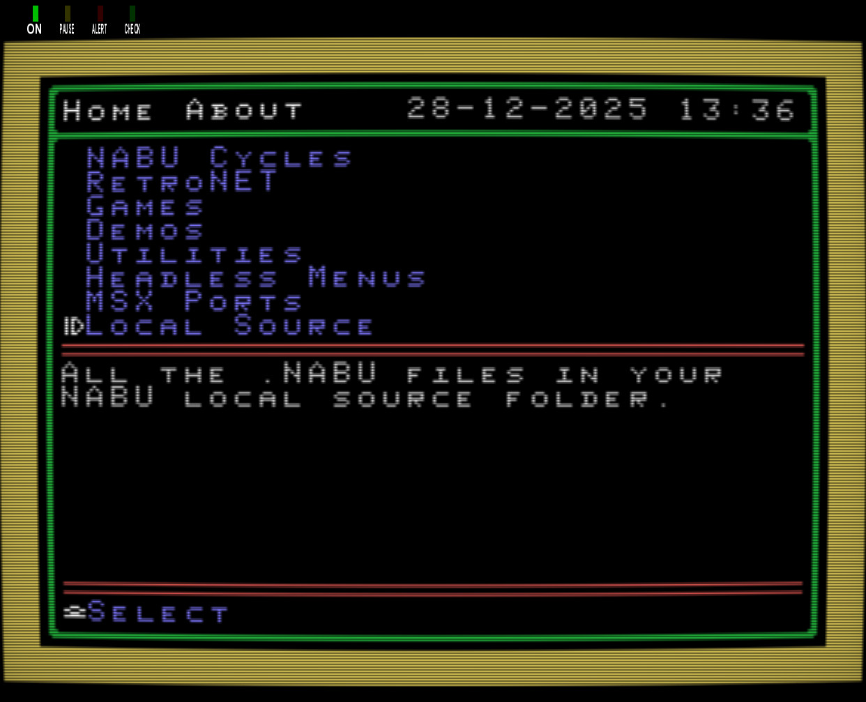 If you boot up your NABU from my NIA, it will start in headless mode running IMAGUI where you can pick from all the usual games and utilities, and use the Local Source option at the very bottom of the categories list to get to Nth Pong Wars. Beware that the joystick action is a bit tricky, since going down in the list of categories usually also triggers a sideways move and just tapping the joystick also presses the fire button; it's best to rock the joystick down along a curve covering the lower left quadrant.