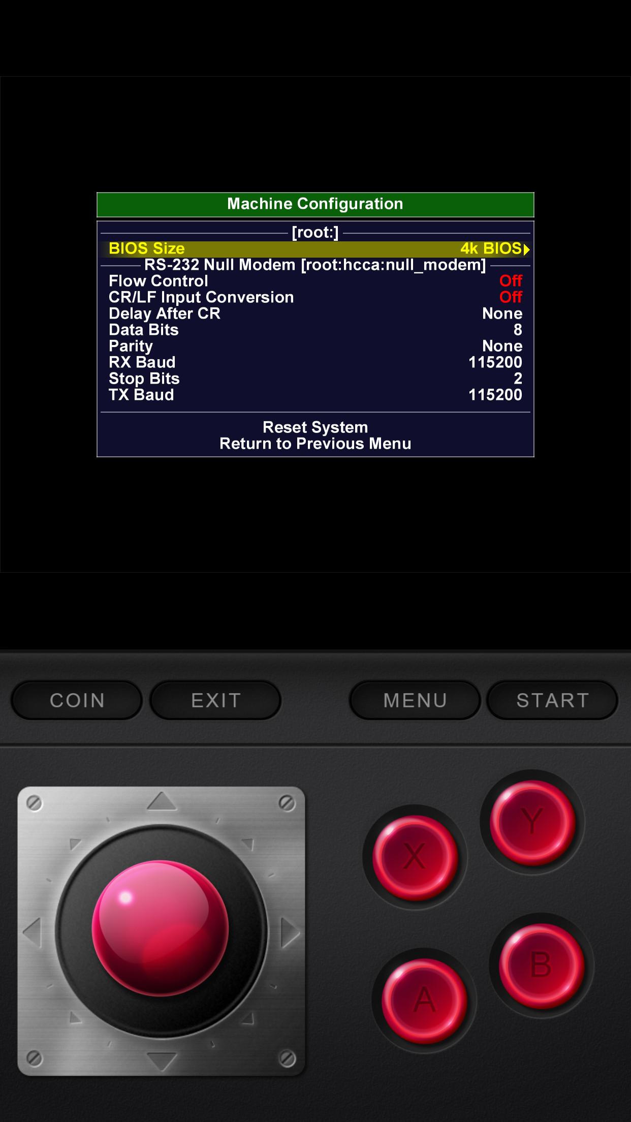 Now run the emulated NABU, and you'll see errors on the NIA complaining about receiving $FF and not getting the hello message. That's progress, you've got a malfunctioning connection! The problem is the emulated baud rate, which you can change in the NABU MAME settings while running the game (when it's displaying the MAME menu just before starting to run, pick Configure from the pop-up menu, then use the joystick and buttons to navigate). The Machine Configuration menu has the baud rate, see the screen shot for working settings.